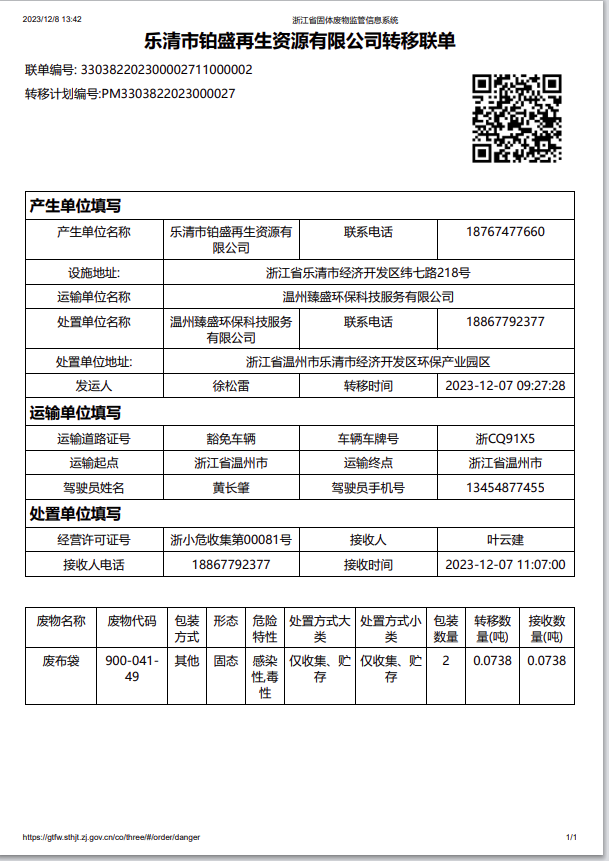 樂清市鉑盛再生資源有限公司2023年度危險廢物處置公示